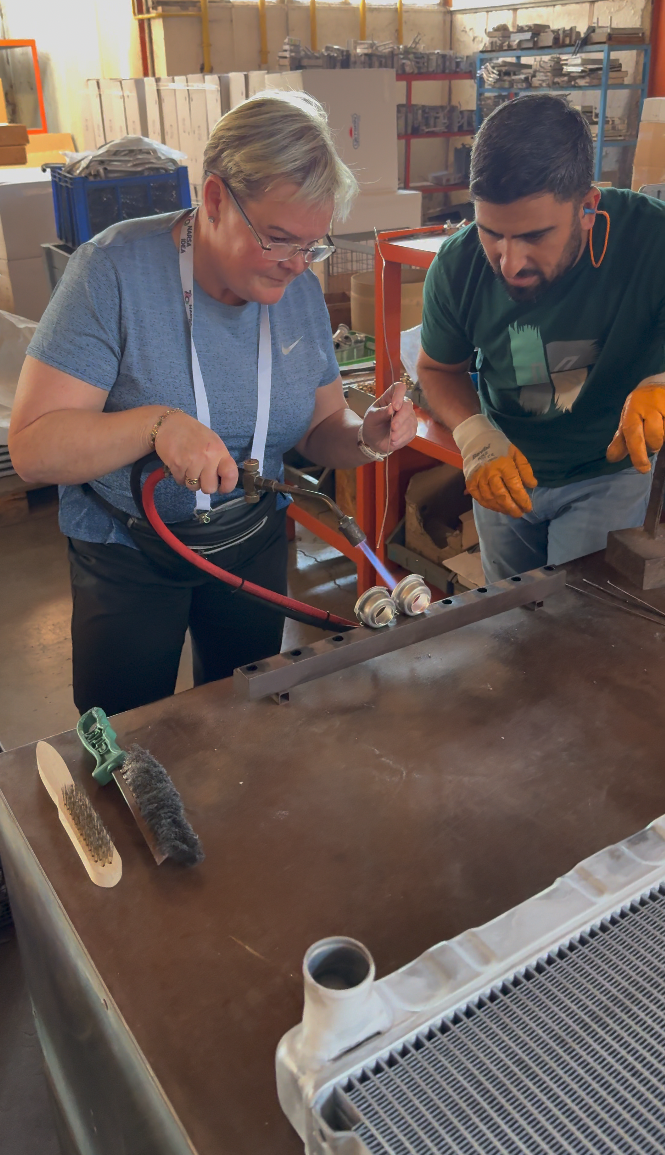 “When we were walking through the plant, I saw a guy welding an aluminium radiator,” said Ingibergsdóttir. “I saw he was welding with solder. So I went to one of the owners and asked him about it. I asked if he could give me a sample or tell me what kind of wire he was using. Then before we left, he took me to where the repairman was and told me, ‘No, I’m going to let you try.’ And so he brought me a brand new radiator and had me two different weldings. He showed me how he welds the tube to header. We used a wire that has a lower temperature. We cleaned around the tube with flux, and then we filled the gap.”